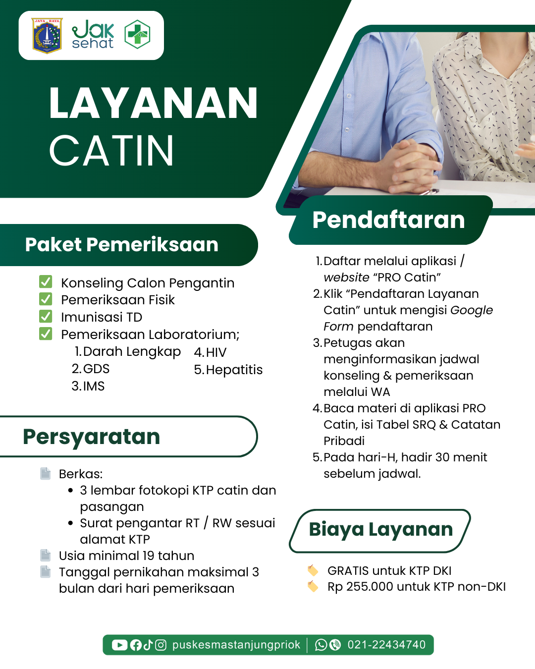 Pelayanan calon pengantin (CATIN) adalah rangkaian pemeriksaan kesehatan yang dilakukan pada pasangan yang akan menikah. Tujuannya untuk memastikan kesehatan calon pengantin secara fisik dan mental, serta mendeteksi dini penyakit keturunan dan penyakit yang berisiko menular.