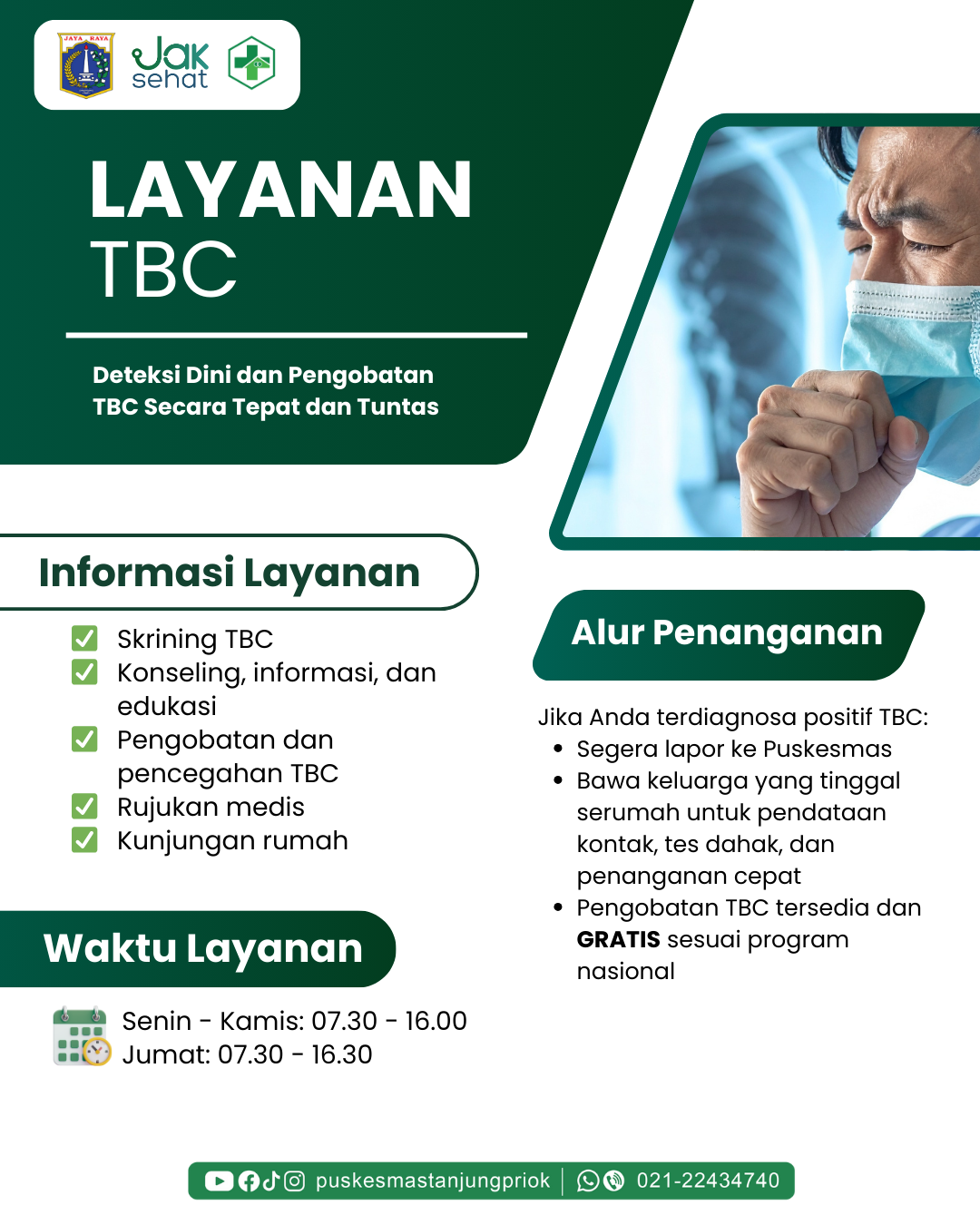 Pelayanan pemeriksaan TBC di Puskesmas Tanjung Priok merupakan pelayanan yang dilakukan dengan tujuan deteksi dini atau penjaringan suspek TBC serta penanganan dan pengobatan terhadap pasien TBC. Sarana prasarana yang terdapat dalam pelayanan pemeriksaan TBC diantaranya adalah Ruang Pemeriksaan TBC, Hepa Filter, Bilik dahak, Kipas angin, Almari, Rak arsip, Meja, Kursi, Toilet, Ruang tunggu pasien TBC, Tensimeter, Stetoskop, Pot sputum, Thermogun, Timbangan. Petugas pelaksana dalam pelayanan pemeriksaan TBC di Puskesmas Tanjung Priok yaitu Dokter dan Perawat.